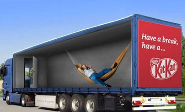 Kit Kat cashed in on its well-known slogan by featuring a scarily lifelike depiction of a truck driver enjoying the chocolate candy while laying on a hammock.