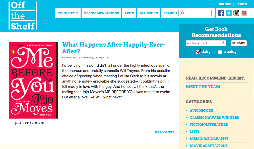 In 2014, this New York-based publishing company launched Off the Shelf, a book review website. The site’s daily reviews are written by Simon & Schuster employees and guest contributors, attracting literature enthusiasts from far and wide.