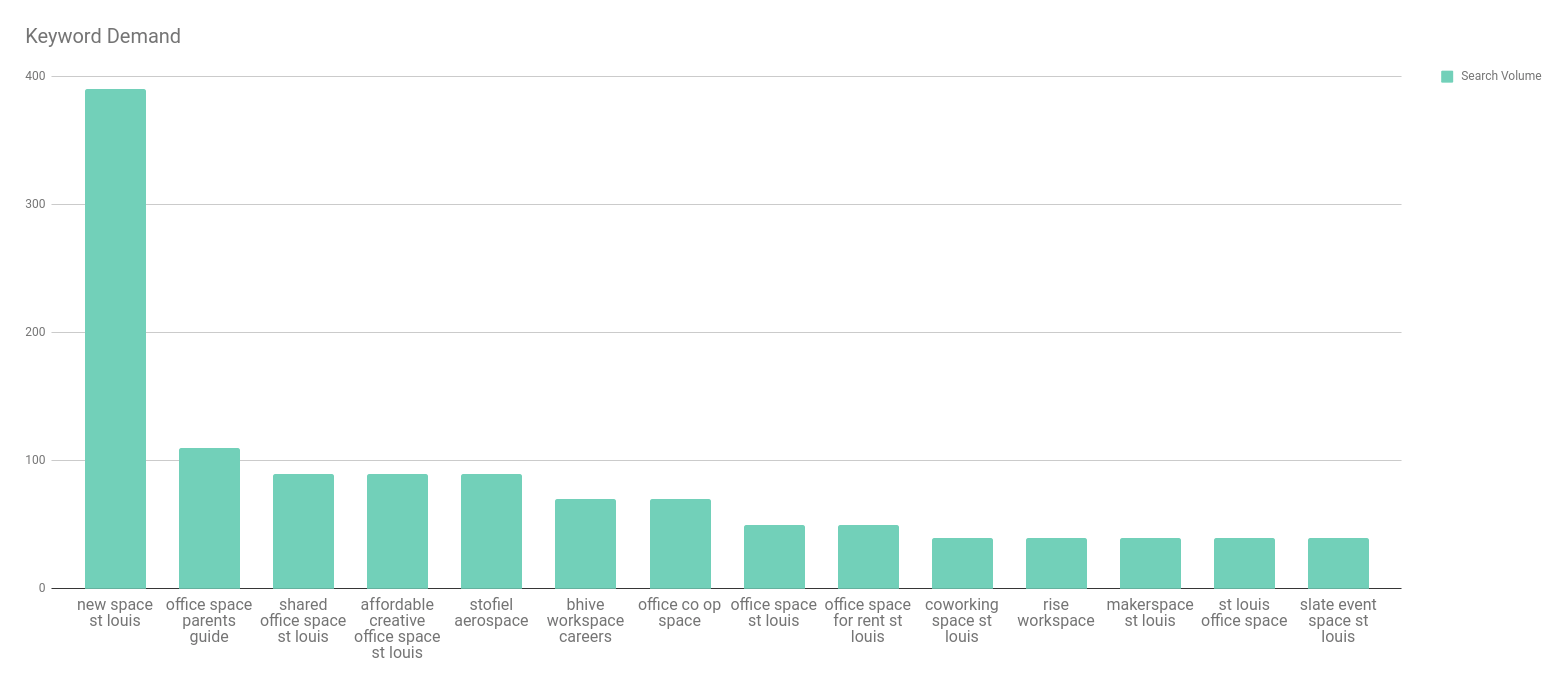 The Pareto Distribution is relevant to your digital presence because search engine results, keywords, and websites follow the same trend. For example, consider the specific search terms associated with any broad search topic, such as “coworking spaces”: general keyword terms will capture the bulk of the traffic, while a large number of more niche keywords will sweep up the rest. See this example from my previous article on using search data to power your writing strategy: