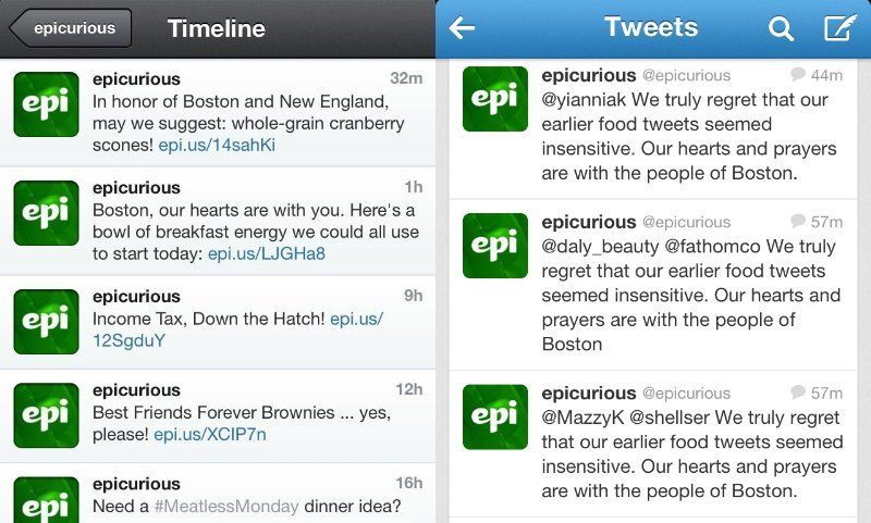 Take foodie website Epicurious, for example. The brand took to Twitter to express their condolences to the families of the victims of the Boston marathon bombing. But they couldn’t leave it there — oh, no. Instead, the brand included a totally unnecessary and overly promotional recipe link, presented as the “breakfast bowl of energy we could all use to start the day.”